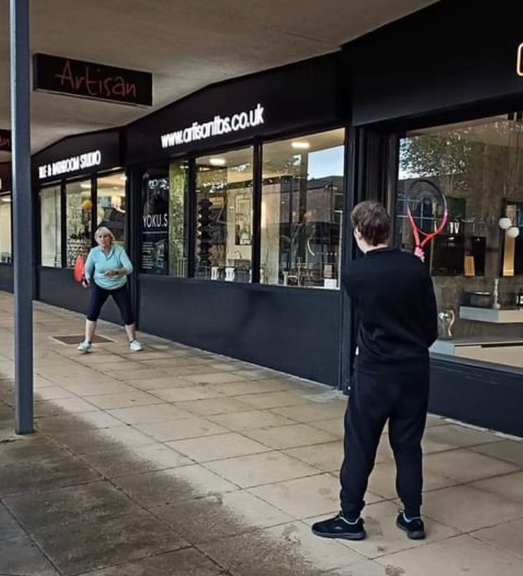 From the court to the hub, the hub to playing under the shop canopy and then out into the shopping precinct. Sue really enjoyed seeing the shoppers faces as they came out of Tesco's.